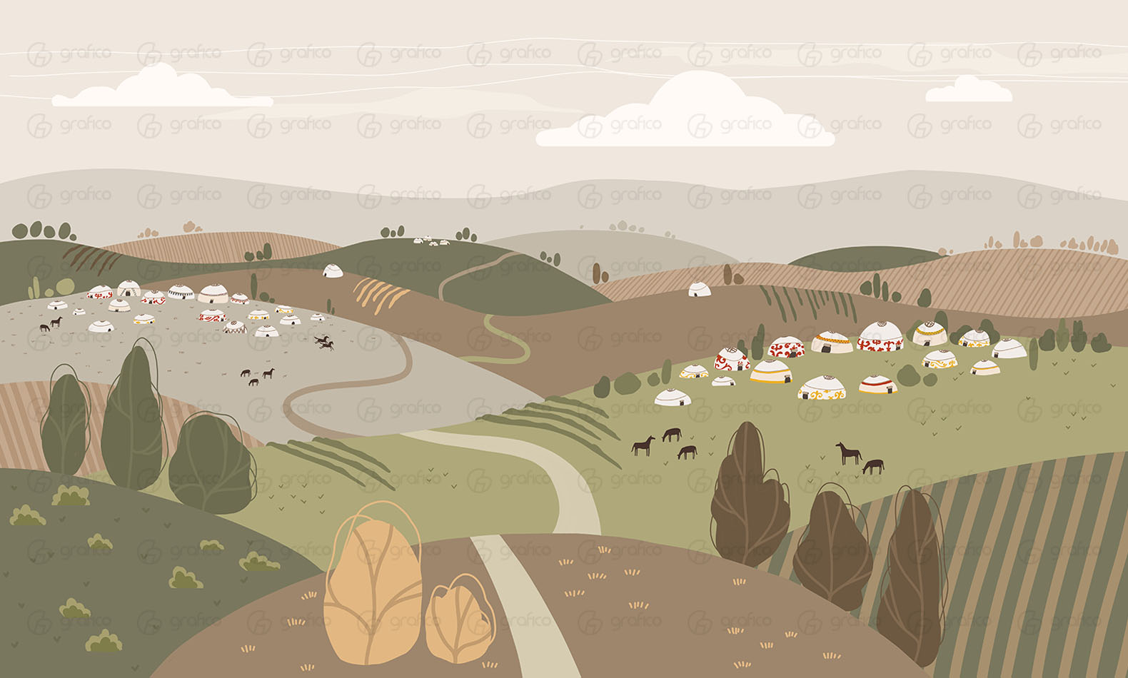 Юрты, холмы, деревья, лошади, степь