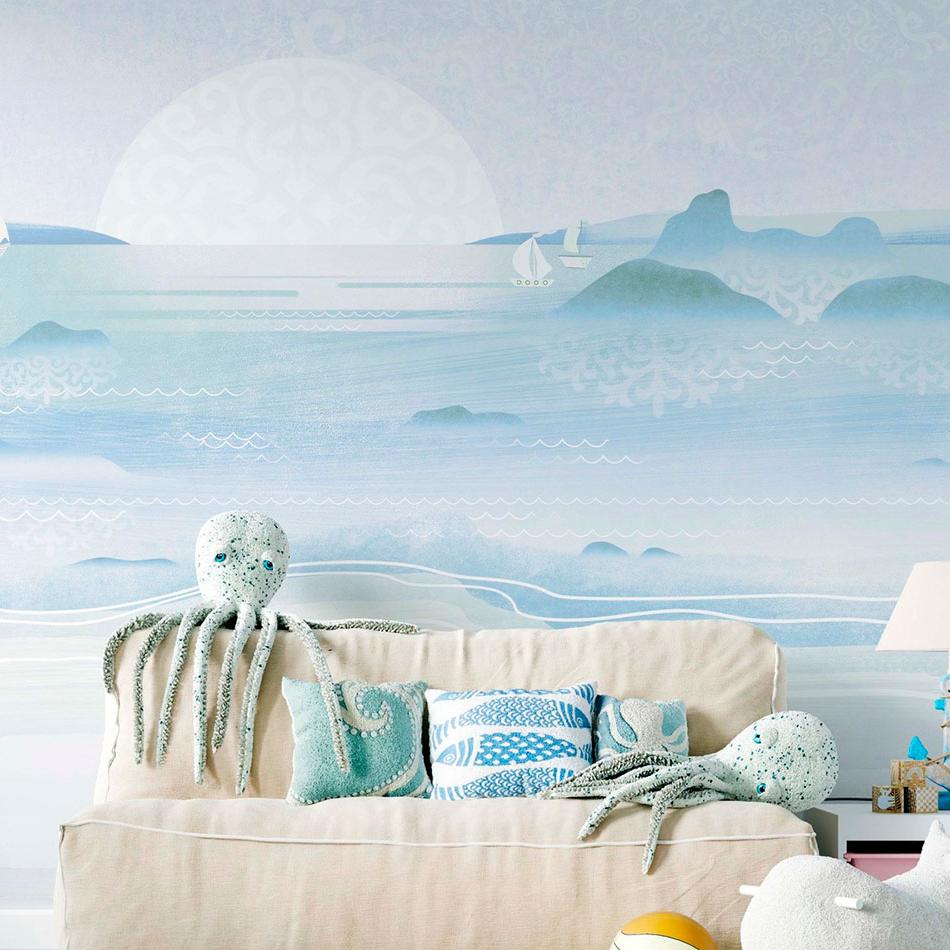 Спокойная морская панорама в нежных тонах с парусными лодками, мягкими волнами и силуэтами островов. Лёгкая дымка и стилизованные орнаменты создают атмосферу умиротворения и гармонии. Такой дизайн наполняет интерьер свежестью и простором, идеально подойдёт для спальни, гостиной или зоны отдыха.
