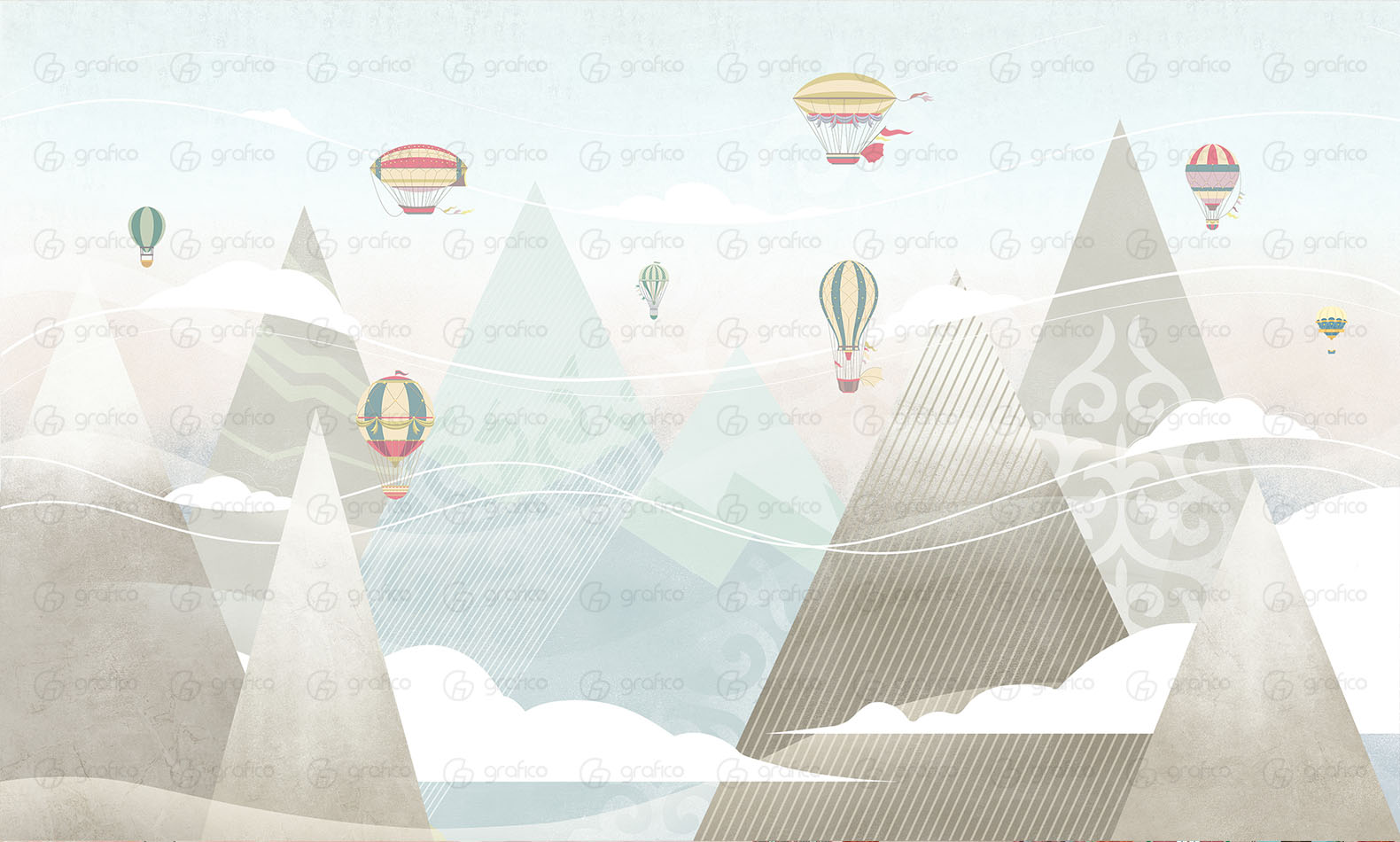 Лёгкая и воздушная композиция с величественными горами и парящими в небе воздушными шарами. Тёплые бежево-пастельные оттенки создают атмосферу уюта и спокойствия, а стилизованные казахские орнаменты вносят национальный колорит. Такой дизайн станет ярким акцентом в гостиной, детской или офисе, придавая пространству ощущение свободы и вдохновения.