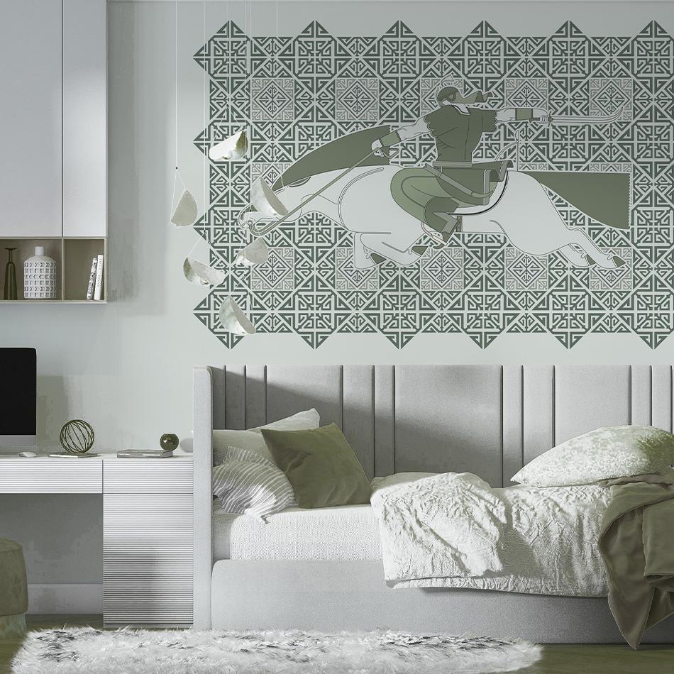 Эффектная фреска с образом воина на вздыбленном коне. Силуэт батыра символизирует силу, свободу и движение. Такой дизайн придаёт интерьеру динамику и создаёт выразительный акцент в пространстве. Подходит для оформления стен в гостиных, подростковых спальнях, кабинетах, арт-пространствах, кафе и конференц-залах. Станет гармоничным решением для интерьеров в современном и этническом стиле.