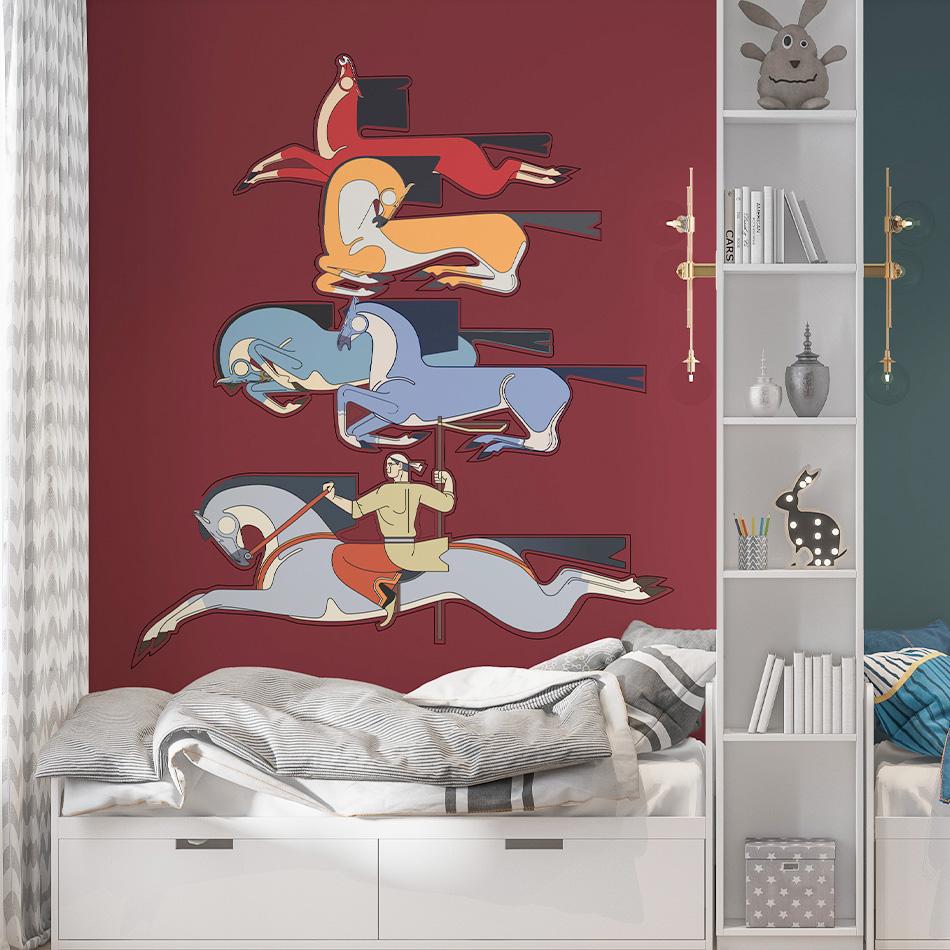 Сила, скорость, ловкость — всё это собрано в динамичной композиции, вдохновлённой традиционной казахской игрой "Құрық салу". Фигуры скакунов создают ощущение движения и преемственности поколений. Минималистичная палитра и выразительная графика делают композицию современным акцентом для интерьера. Обои подойдут для подростковой спальни, холла или арт-пространства, где ценят культурную идентичность и национальную эстетику.