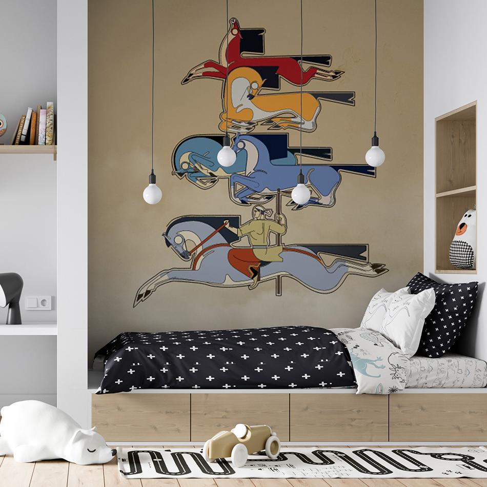 Сила, скорость, ловкость — всё это собрано в динамичной композиции, вдохновлённой традиционной казахской игрой "Құрық салу". Фигуры скакунов создают ощущение движения и преемственности поколений. Минималистичная палитра и выразительная графика делают композицию современным акцентом для интерьера. Обои подойдут для подростковой спальни, холла или арт-пространства, где ценят культурную идентичность и национальную эстетику.