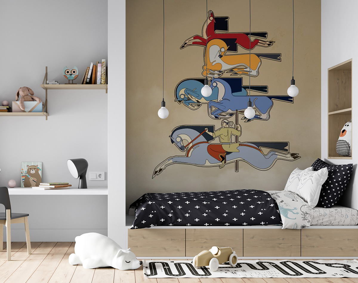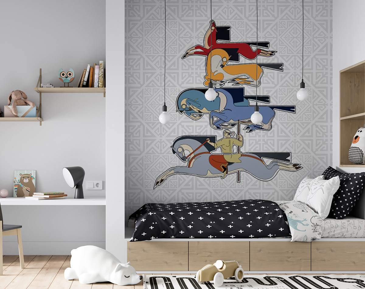 Сила, скорость, ловкость — всё это собрано в динамичной композиции, вдохновлённой традиционной казахской игрой "Құрық салу". Фигуры скакунов создают ощущение движения и преемственности поколений. Минималистичная палитра и выразительная графика делают композицию современным акцентом для интерьера. Обои подойдут для подростковой спальни, холла или арт-пространства, где ценят культурную идентичность и национальную эстетику.