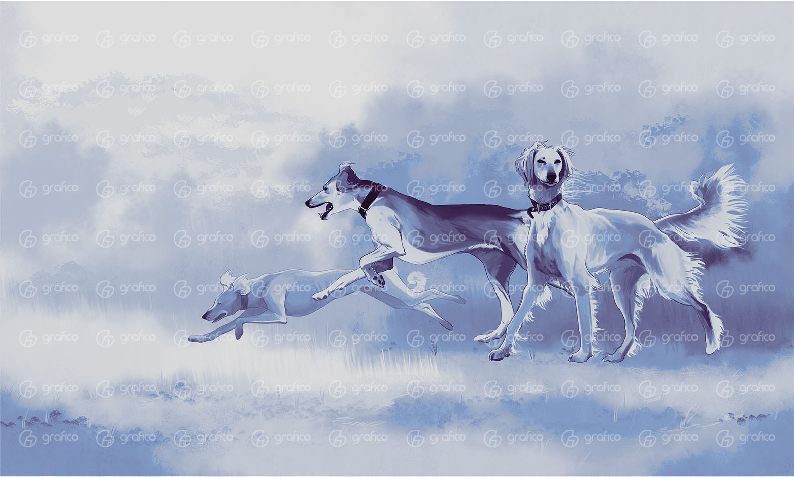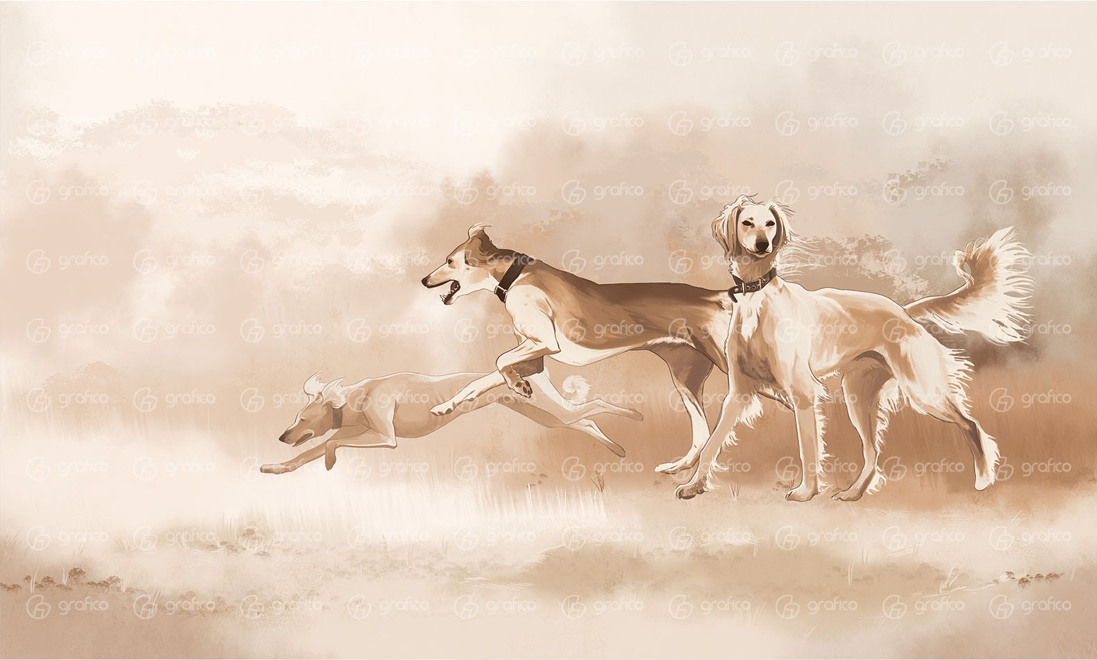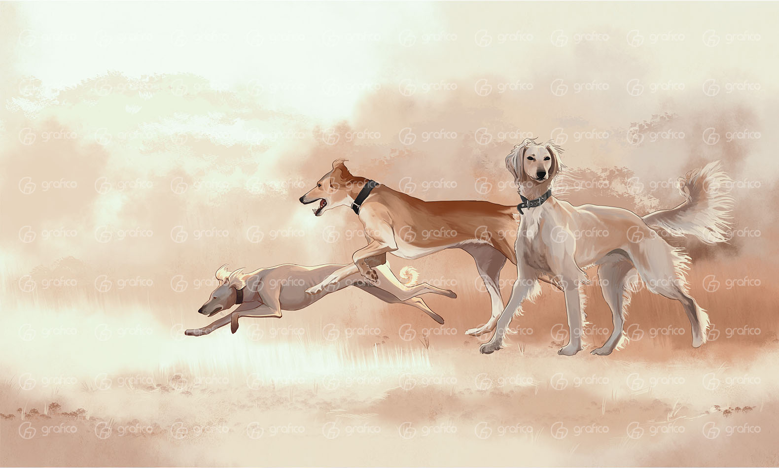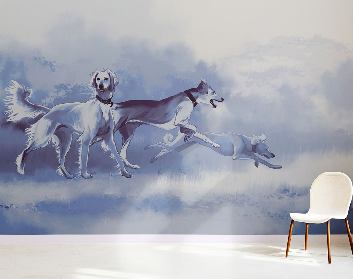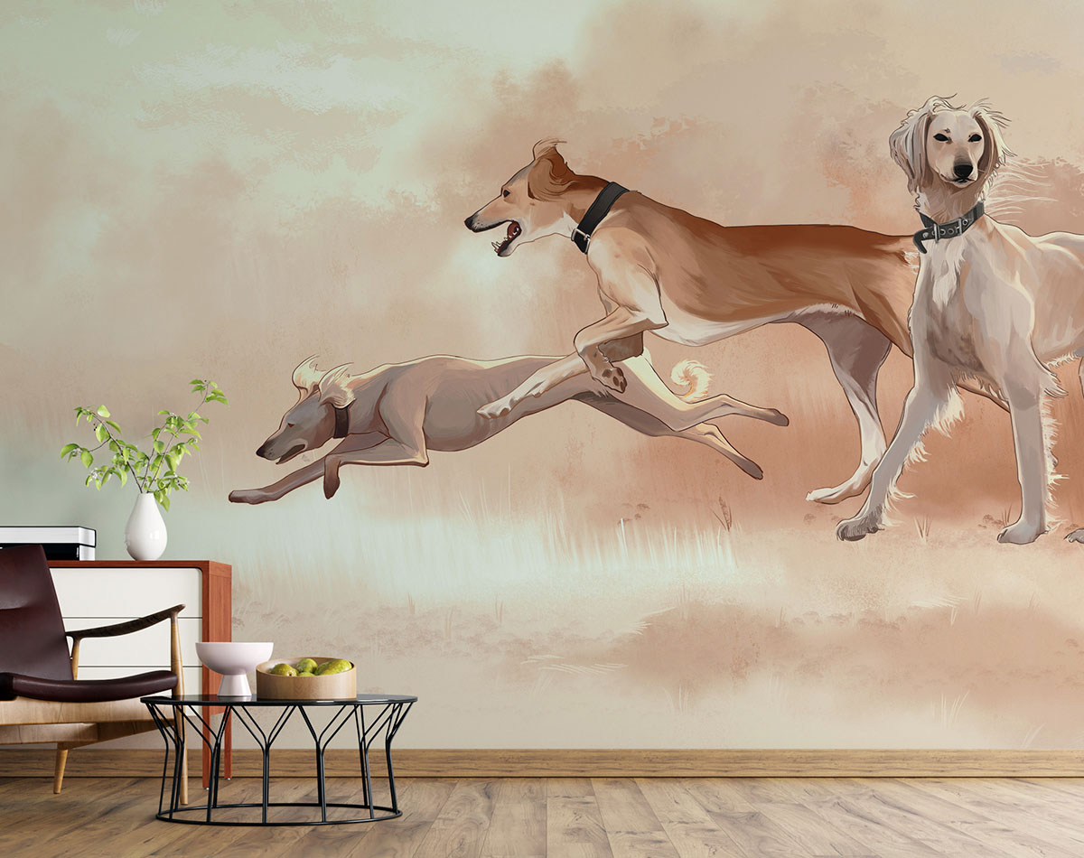 Авторская фреска изображает трёх тазы — традиционных казахских охотничьих борзых, известных своей скоростью, выносливостью и элегантным силуэтом. Мягкая палитра, плавные линии и проработанные детали передают лёгкость движения и энергетику степи. Дизайн подойдёт для интерьеров в этническом, современном или эко-стиле, добавляя пространству глубину и характер. Идеально для оформления гостиных, спален, кабинетов, ресторанов, отелей и креативных пространств.