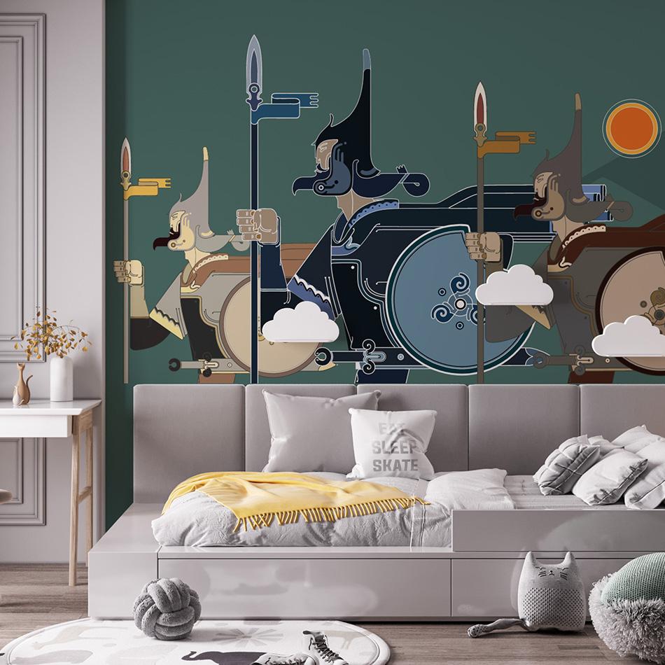 Эффектная фреска в этническом стиле с изображением трёх воинов. Чёткие силуэты и графичная композиция передают мощь, стойкость и дух кочевников. Глубокие оттенки создают атмосферу гармонии и силы, делая интерьер выразительным и наполненным историей. Подходит для современных и этнических интерьеров. Идеально смотрится в подростковой спальне, кабинете, конференц-зале или арт-пространстве. Подчеркнёт характер ресторана, тематического отеля или зоны отдыха, где важен национальный колорит
