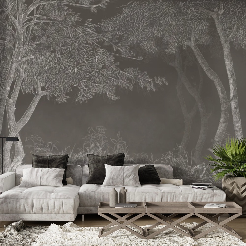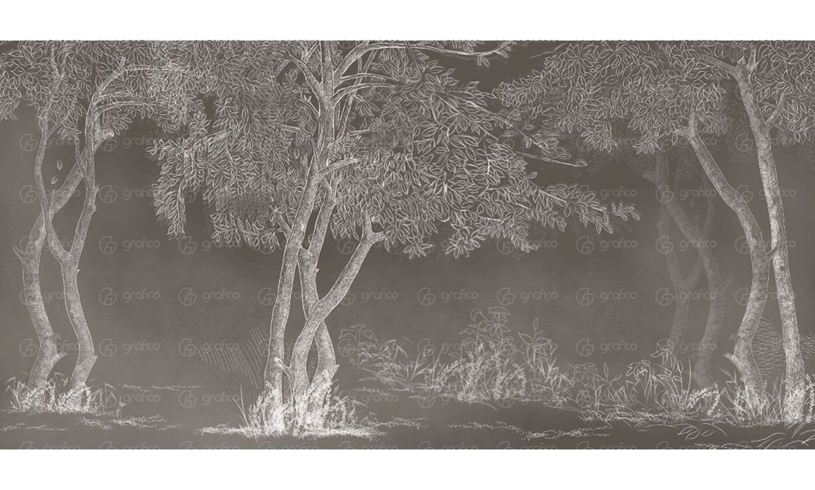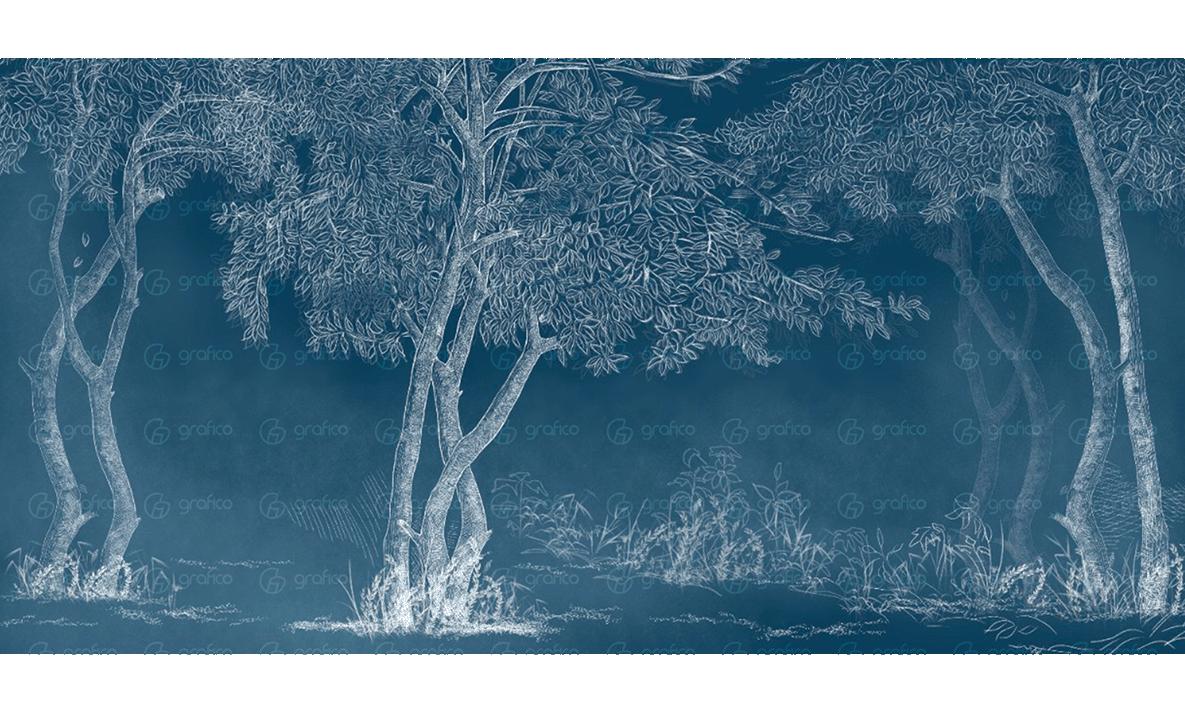 Элегантная фреска с изображением деревьев в технике графической гравюры. Глубокий синий фон и белые линии создают атмосферу уюта, свежести и природной гармонии. В ассортименте доступен и светлый вариант исполнения для светлых интерьеров.
