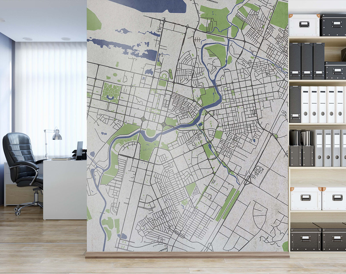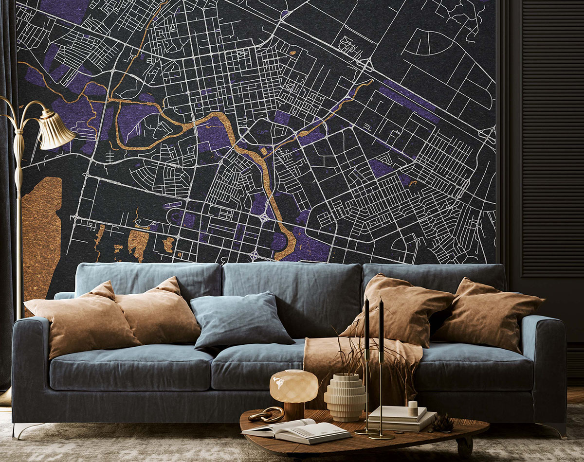Стильная настенная фреска с картой Астаны. Современный минималистичный дизайн с акцентами золота и глубокого фиолетового создаёт атмосферу урбанистической динамики и утончённости. В ассортименте доступен и светлый негативный вариант исполнения, что позволяет подобрать решение под любой интерьер. Подходит как для жилых пространств, так и для офисов. Идеально для гостиной, кабинета, офиса, коворкингов, кафе и лофт-интерьеров.