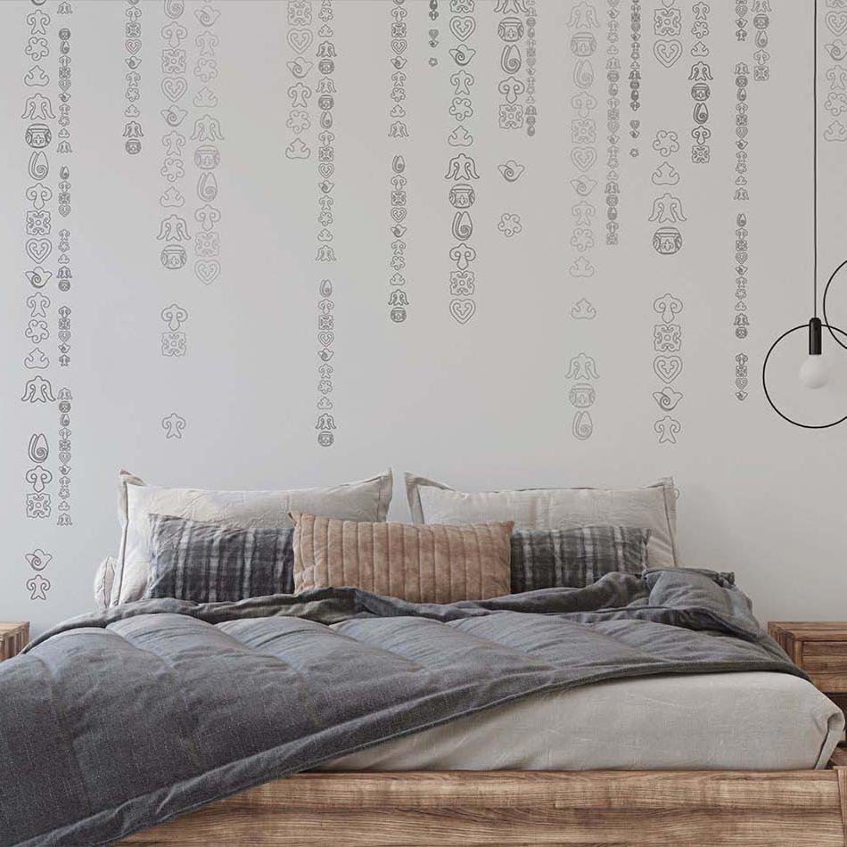 Современная фреска с казахскими национальными мотивами. Вертикальные нити орнаментов создают ощущение легкости, динамики и простора, подчёркивая этнический характер интерьера. Подходит для современных и классических пространств, а также интерьеров в этно-стиле. Идеальна для гостиной, спальни, кабинета, ресторана, зоны отдыха и пространств с этническим акцентом.