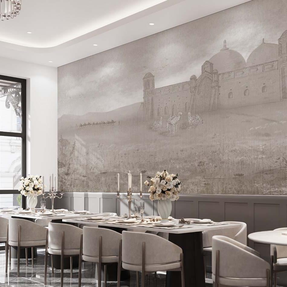 Бесшовная обои-фреска "Arystanbab" с караваном и восточной архитектурой переносит в атмосферу Великого шелкового пути. На фоне степных пейзажей изображён караван верблюдов, движущийся к величественному архитектурному сооружению в восточном стиле. Мягкие бежево-песочные тона, плавные линии и тонкая графика создают эффект лёгкой дымки. Такое панно гармонично подчеркнёт интерьер гостиной, кабинета, тематического кафе или этнического ресторана, придавая пространству глубину и национальный колорит.