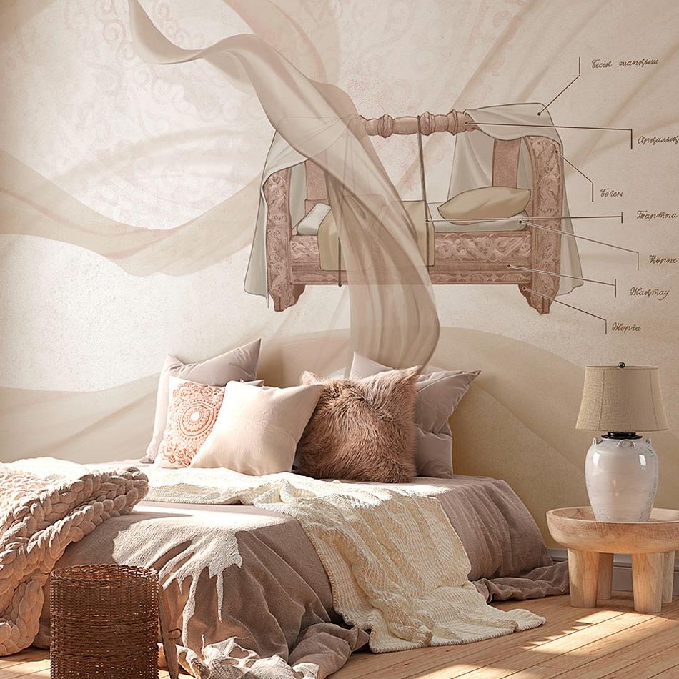 Бесшовная обои-фреска с национальной колыбелью и парящими тканями. В центре композиции — изящное изображение бесика. Нежная палитра дополнена тонкими узорами и мягкими переходами, которые придают интерьеру утончённость и лёгкость. В рисунке сочетаются элементы этники и декоративность, что делает фреску одновременно традиционной и современной. Такой дизайн органично впишется в спальню или детскую, создавая атмосферу защищённости и покоя. В интерьере гостиной или холла он подчеркнёт связь с культурными корнями и придаст пространству индивидуальность.