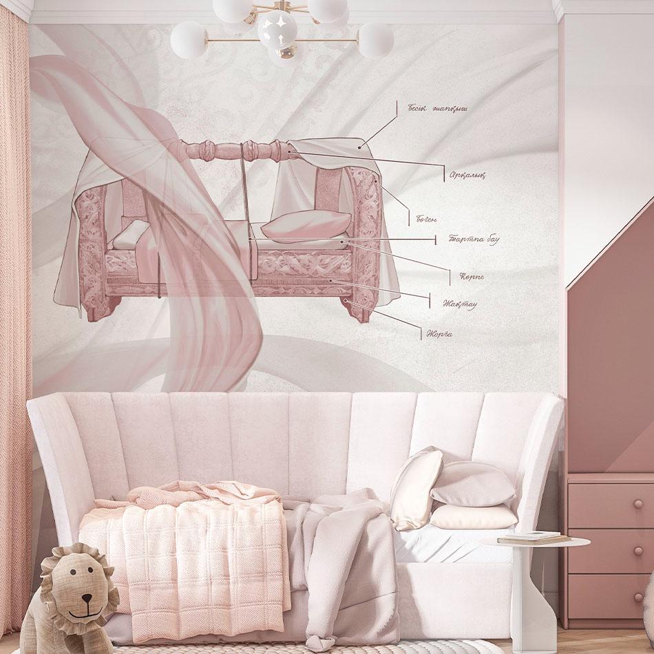 Бесшовная обои-фреска с национальной колыбелью и парящими тканями. В центре композиции — изящное изображение бесика. Нежная палитра дополнена тонкими узорами и мягкими переходами, которые придают интерьеру утончённость и лёгкость. В рисунке сочетаются элементы этники и декоративность, что делает фреску одновременно традиционной и современной. Такой дизайн органично впишется в спальню или детскую, создавая атмосферу защищённости и покоя. В интерьере гостиной или холла он подчеркнёт связь с культурными корнями и придаст пространству индивидуальность.