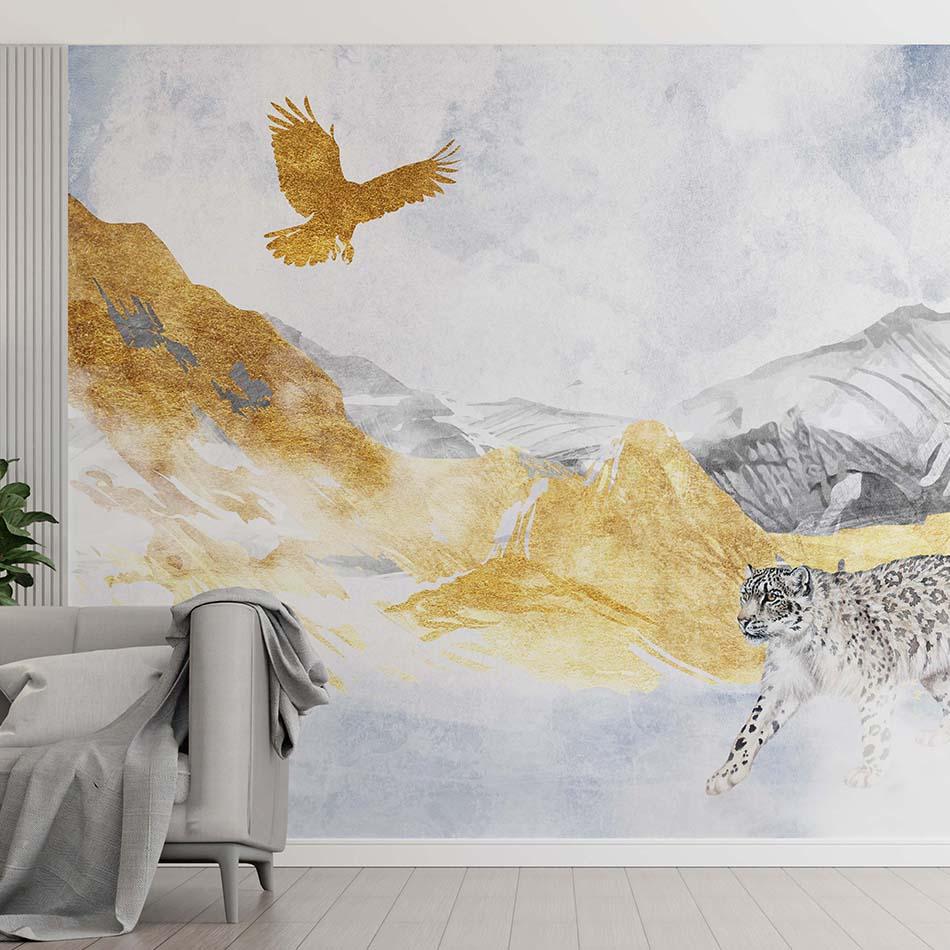 Бесшовная обои-фреска "Tianshan Irbis" — это мощный и выразительный горный пейзаж, выполненный в акварельной технике. Композиция изображает величественные пики Тянь-Шаня, в центре которой находится грациозный снежный барс (ирбис), а над ним парит могучий беркут. Палитра из серых, бежевых и сине-голубых оттенков передаёт атмосферу сурового, но завораживающего высокогорья. Фактура, имитирующая акварельные мазки и разводы, придаёт изображению лёгкость и художественную выразительность. Эта фреска станет впечатляющим акцентом в гостиной, офисе или тематическом интерьере, подчёркивая любовь к природе и приключениям. Подходит для оформления интерьеров в стиле этно, эко, бохо и современный минимализм.