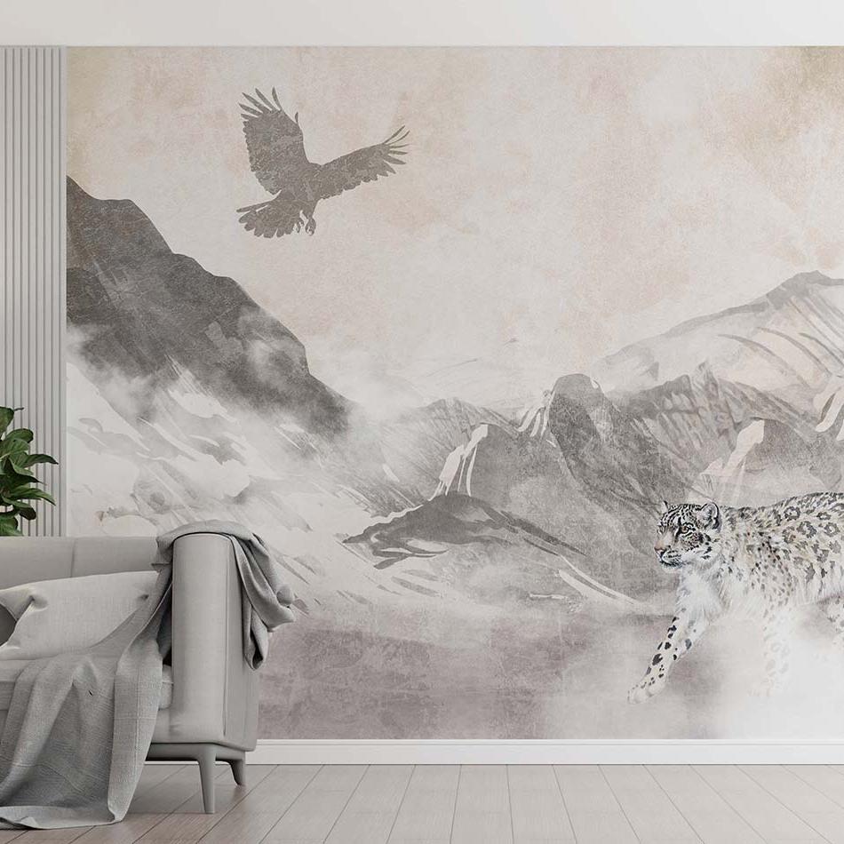 Бесшовная обои-фреска "Tianshan Irbis" — это мощный и выразительный горный пейзаж, выполненный в акварельной технике. Композиция изображает величественные пики Тянь-Шаня, в центре которой находится грациозный снежный барс (ирбис), а над ним парит могучий беркут. Палитра из серых, бежевых и сине-голубых оттенков передаёт атмосферу сурового, но завораживающего высокогорья. Фактура, имитирующая акварельные мазки и разводы, придаёт изображению лёгкость и художественную выразительность. Эта фреска станет впечатляющим акцентом в гостиной, офисе или тематическом интерьере, подчёркивая любовь к природе и приключениям. Подходит для оформления интерьеров в стиле этно, эко, бохо и современный минимализм.