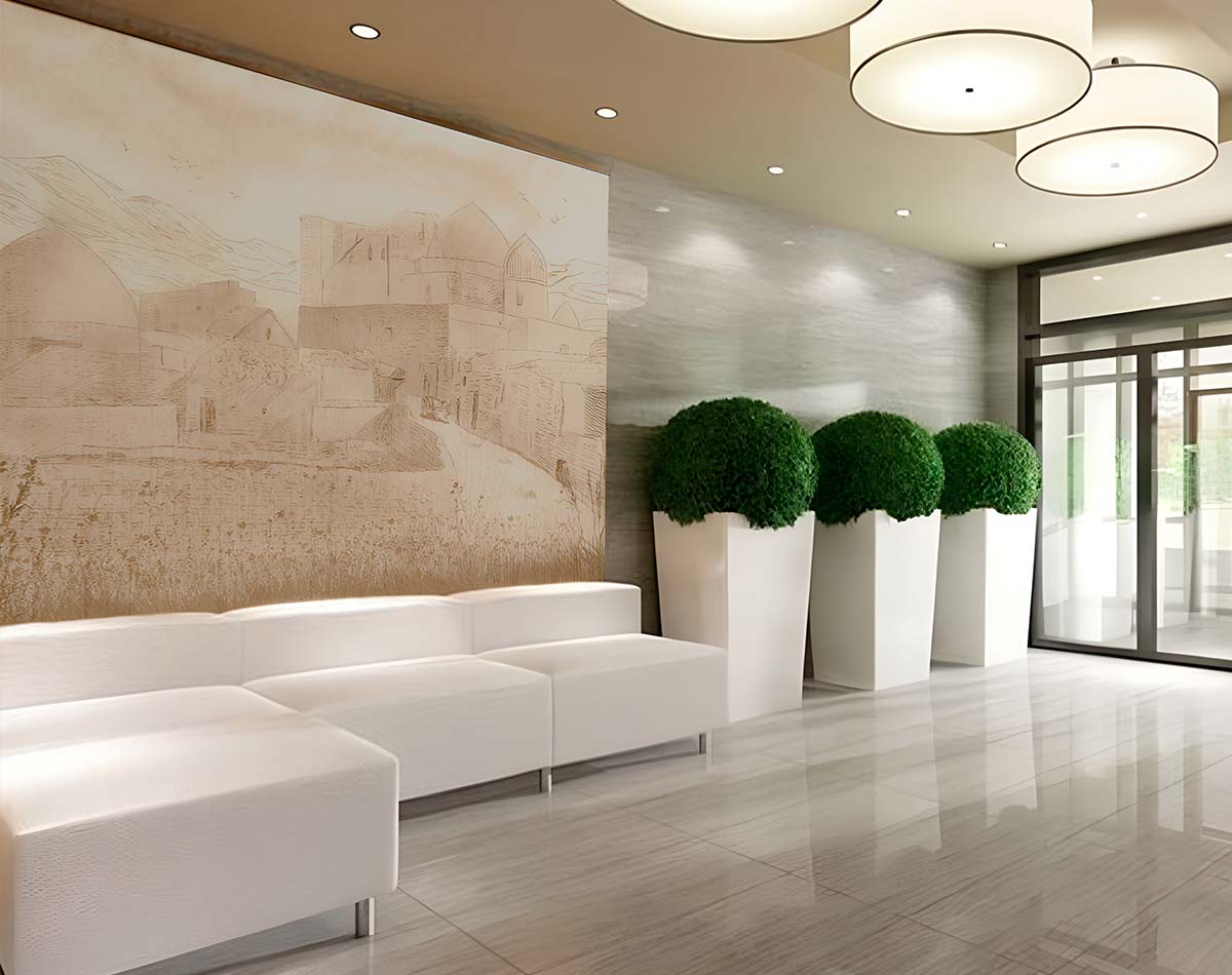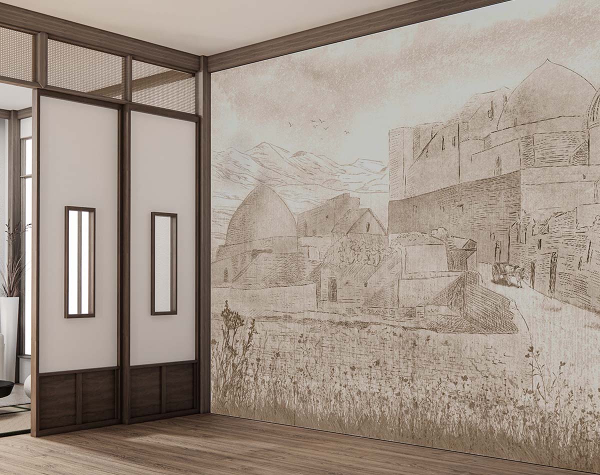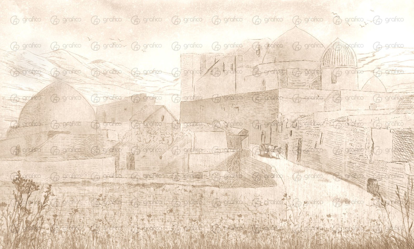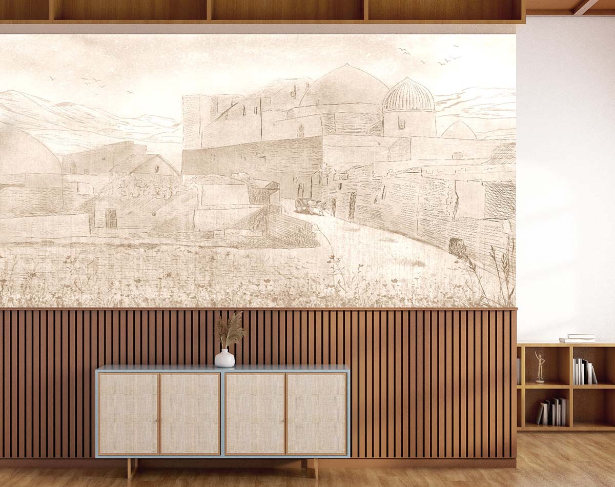 Фреска "Turkestan" выполненная в технике гравюры, что придает им особый винтажный шарм. На фреске изображен исторический городской пейзаж с характерными купольными сооружениями, массивными зданиями и узкими улочками, напоминающими архитектуру Среднего Востока. На заднем плане виднеются горные хребты, а передний план оживляет детально прорисованная растительность, создающая ощущение глубины и перспективы. Монохромная палитра и детализация в стиле эскиза придают изображению благородный и утонченный вид, создавая атмосферу спокойствия, истории и путешествий. Идеально подходят для создания уникального интерьера в классическом, восточном или этно-стиле, добавляя пространству глубину, характер и художественную ценность.