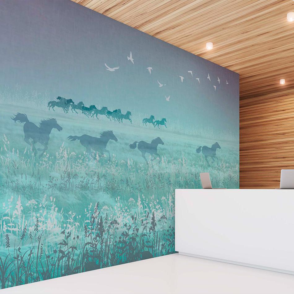 Фреска "Uly Dala" — воплощает дух бескрайних казахских степей. На фоне величественных гор и туманного рассвета изображён табун свободных лошадей, несущихся по цветущему полю. Лёгкие золотистые акценты птиц в небе добавляют композиции изысканность и динамику. Такой дизайн создаёт ощущение свободы и движения, идеально подойдёт для просторной гостиной, кабинета или интерьера в этно-стиле, подчёркивая связь с природой и степной культурой.