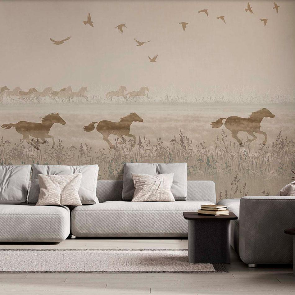 Фреска "Uly Dala" — воплощает дух бескрайних казахских степей. На фоне величественных гор и туманного рассвета изображён табун свободных лошадей, несущихся по цветущему полю. Лёгкие золотистые акценты птиц в небе добавляют композиции изысканность и динамику. Такой дизайн создаёт ощущение свободы и движения, идеально подойдёт для просторной гостиной, кабинета или интерьера в этно-стиле, подчёркивая связь с природой и степной культурой.