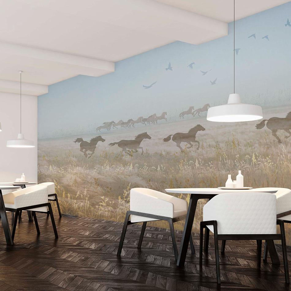 Фреска "Uly Dala" — воплощает дух бескрайних казахских степей. На фоне величественных гор и туманного рассвета изображён табун свободных лошадей, несущихся по цветущему полю. Лёгкие золотистые акценты птиц в небе добавляют композиции изысканность и динамику. Такой дизайн создаёт ощущение свободы и движения, идеально подойдёт для просторной гостиной, кабинета или интерьера в этно-стиле, подчёркивая связь с природой и степной культурой.