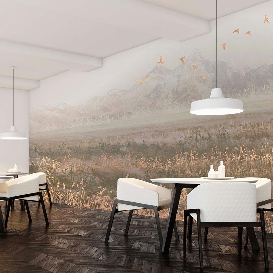 Фреска "Uly Dala" — воплощает дух бескрайних казахских степей. На фоне величественных гор и туманного рассвета изображён табун свободных лошадей, несущихся по цветущему полю. Лёгкие золотистые акценты птиц в небе добавляют композиции изысканность и динамику. Такой дизайн создаёт ощущение свободы и движения, идеально подойдёт для просторной гостиной, кабинета или интерьера в этно-стиле, подчёркивая связь с природой и степной культурой.