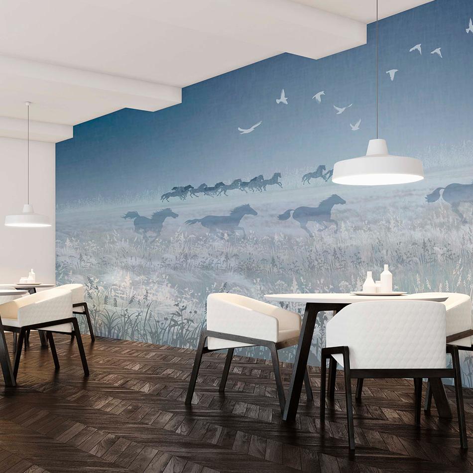 Фреска "Uly Dala" — воплощает дух бескрайних казахских степей. На фоне величественных гор и туманного рассвета изображён табун свободных лошадей, несущихся по цветущему полю. Лёгкие золотистые акценты птиц в небе добавляют композиции изысканность и динамику. Такой дизайн создаёт ощущение свободы и движения, идеально подойдёт для просторной гостиной, кабинета или интерьера в этно-стиле, подчёркивая связь с природой и степной культурой.