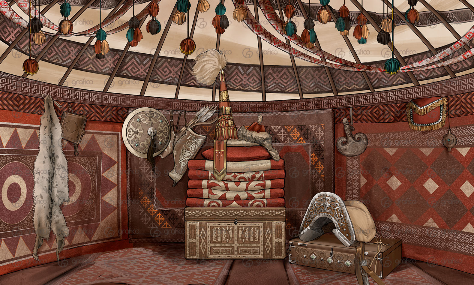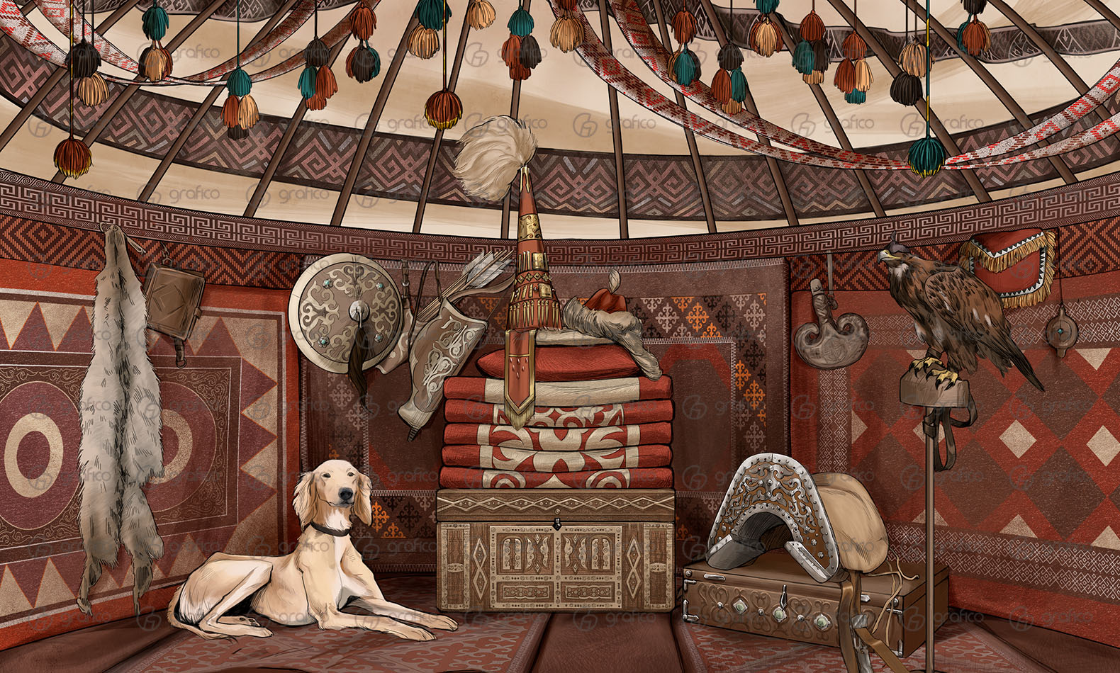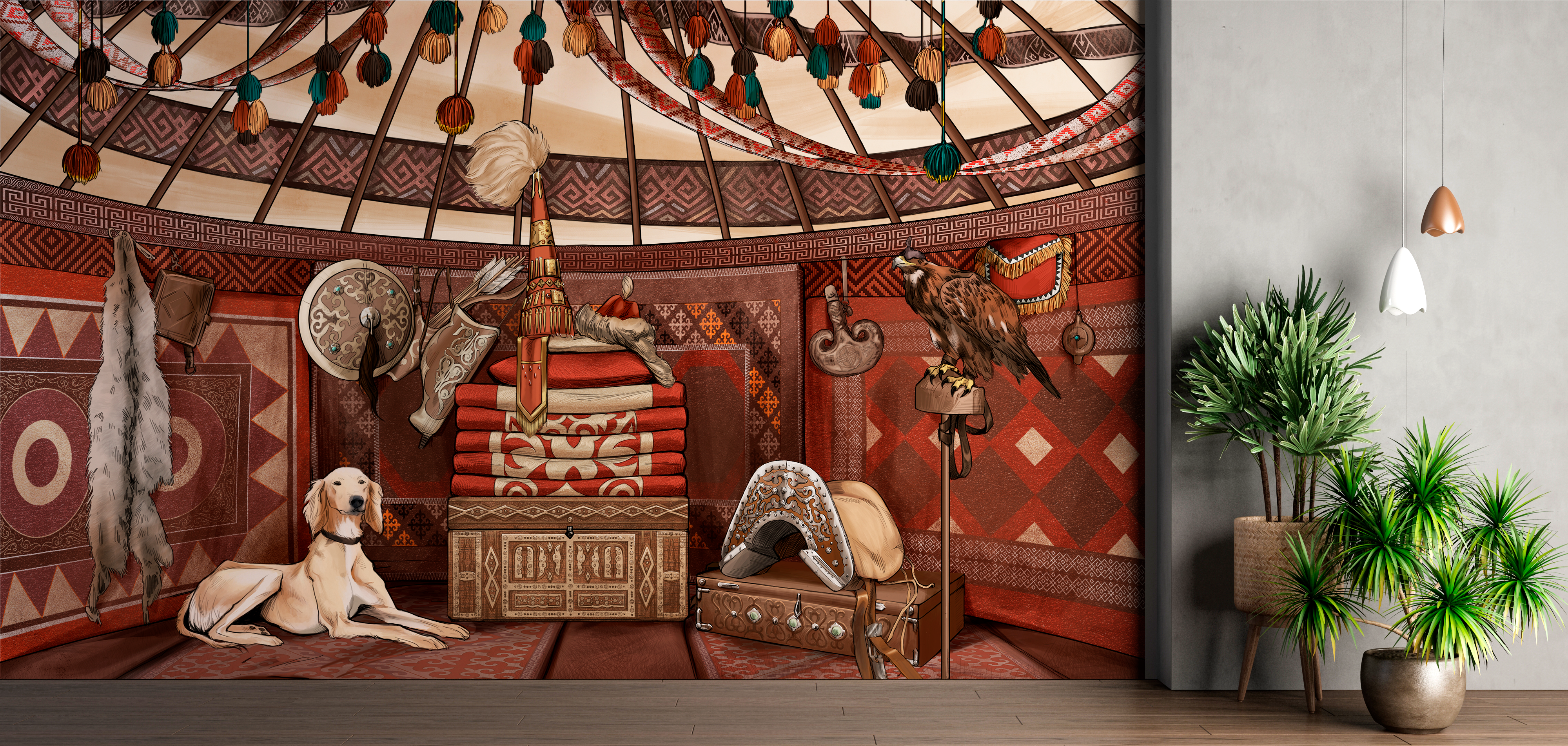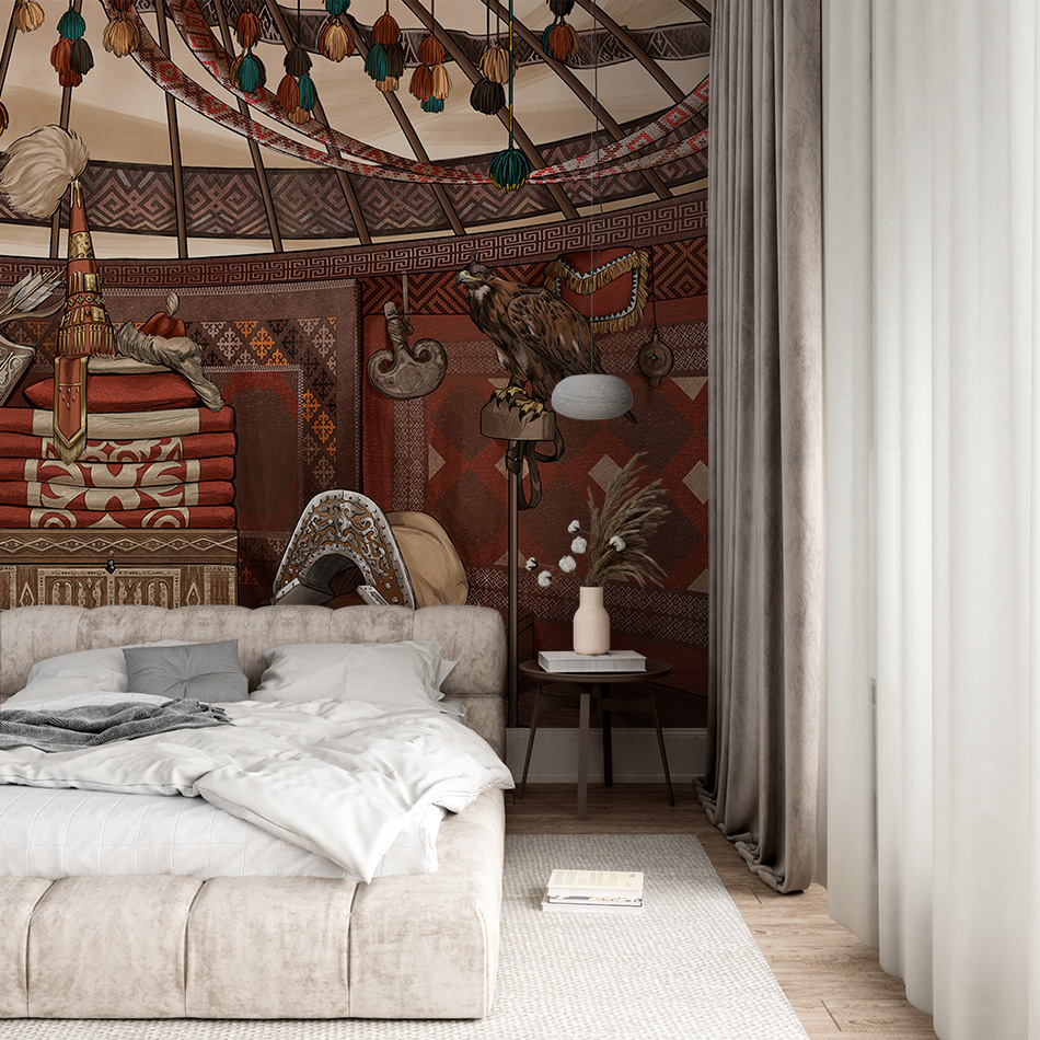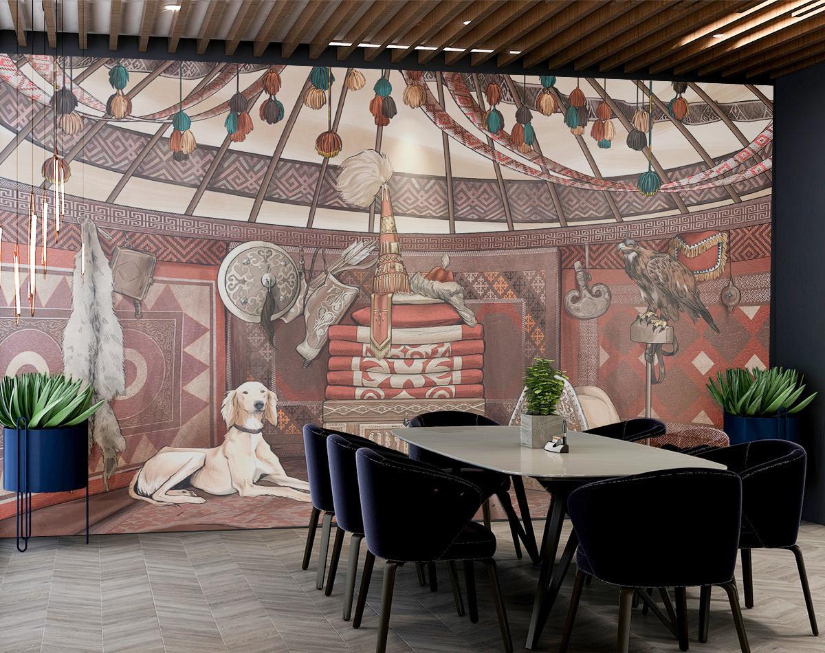Фреска Yurta передаёт атмосферу традиционной казахской юрты. Богатая орнаментальная отделка, охотничий беркут, охотничий пёс тазы, оружие и предметы быта создают аутентичную композицию, наполненную духом кочевой культуры. Тёплая красно-коричневая палитра подчёркивает уют и символизирует связь с землёй и традициями. Такая фреска станет эффектным акцентом в интерьере музея, этно-кафе, учебного заведения, гостиной или креативного пространства, придавая помещению национальный колорит и глубину.