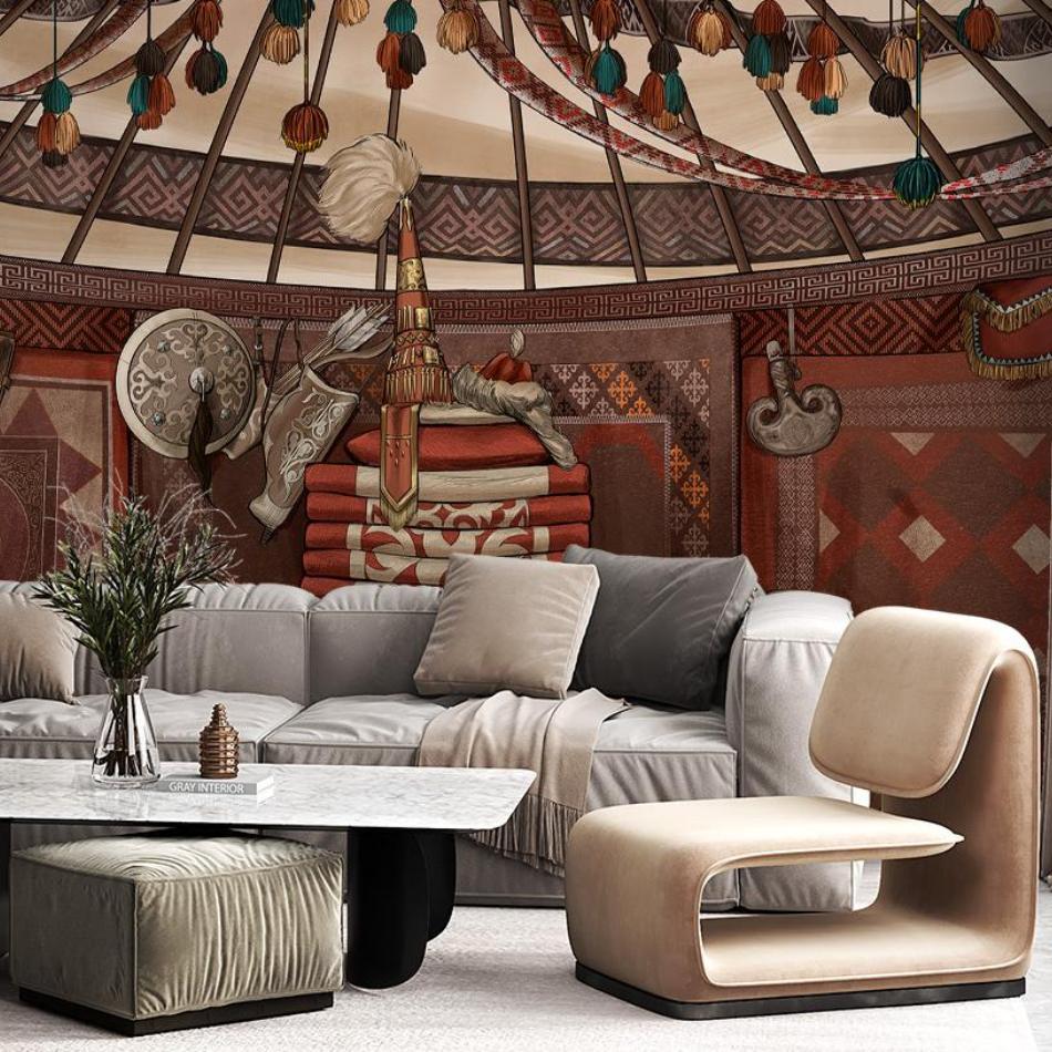 Фреска Yurta передаёт атмосферу традиционной казахской юрты. Богатая орнаментальная отделка, охотничий беркут, охотничий пёс тазы, оружие и предметы быта создают аутентичную композицию, наполненную духом кочевой культуры. Тёплая красно-коричневая палитра подчёркивает уют и символизирует связь с землёй и традициями. Такая фреска станет эффектным акцентом в интерьере музея, этно-кафе, учебного заведения, гостиной или креативного пространства, придавая помещению национальный колорит и глубину.