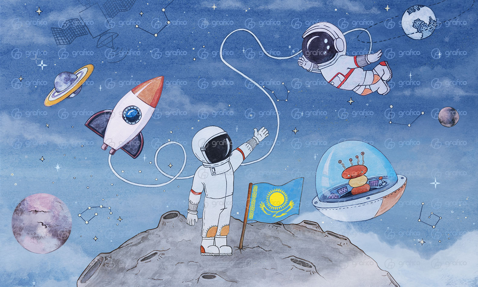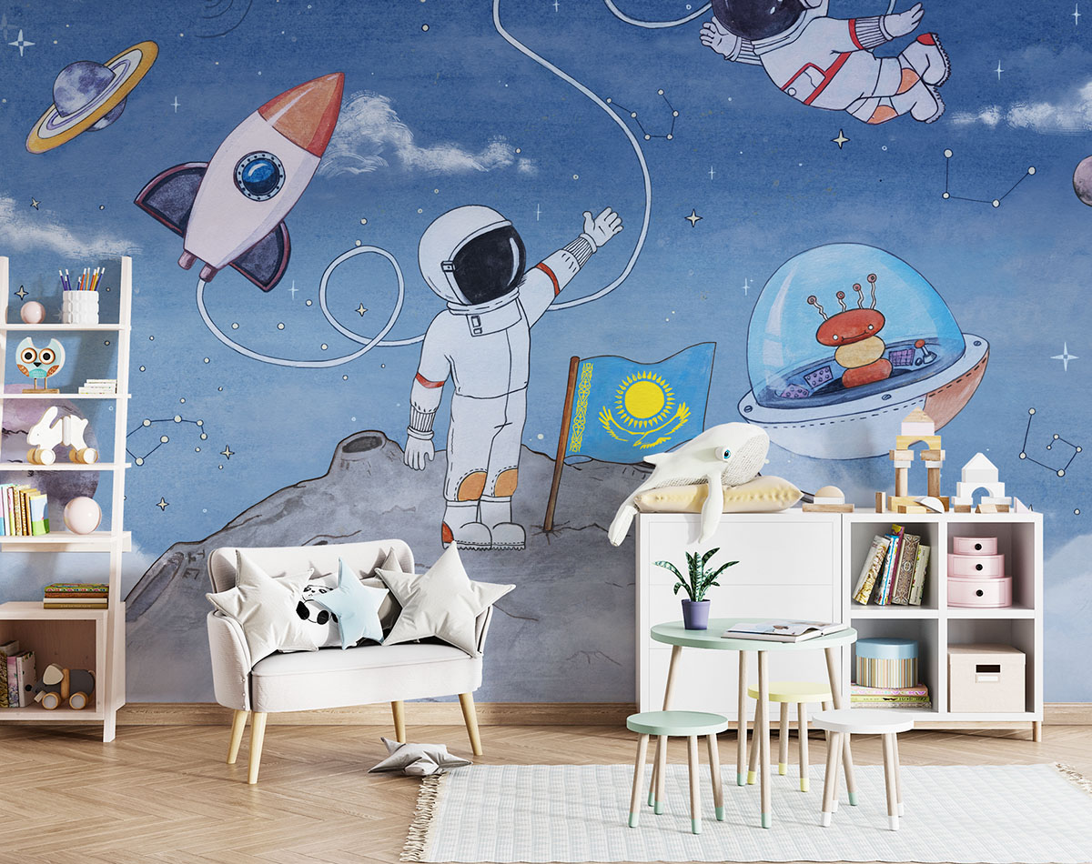 Яркая и увлекательная космическая сцена с астронавтами, исследующими Вселенную. На фоне звездного неба и планет изображены ракета, спутники, созвездия и инопланетный корабль. Один из астронавтов установил флаг Казахстана на поверхности космического объекта, символизируя исследование и покорение новых горизонтов. Этот увлекательный дизайн, пробуждающий любопытство и воображение, вдохновляет детей на изучение космоса и науки, яркие и добрые образы создают атмосферу игры и открытий, легко комбинируется с детской мебелью и тематическим декором. Идеально подойдет для оформления детской комнаты, игровой зоны, творческого уголка или учебного пространства. Также могут использоваться в детских садах, образовательных центрах и креативных студиях.