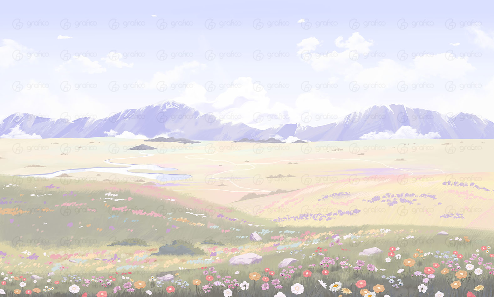 На фреске изображен живописный горный пейзаж с широким цветущим лугом на переднем плане. Вдали возвышаются величественные горы, покрытые снегом, под светлым, слегка облачным небом. Поле усеяно разнообразными полевыми цветами пастельных оттенков – розовыми, оранжевыми, белыми, фиолетовыми, желтыми, создавая ощущение весенней или летней идиллической природы. Через луг протекает извилистая река или ручей, отражая небо. Стиль рисунка напоминает мягкую акварельную живопись или иллюстрацию, создавая атмосферу спокойствия и умиротворения, характерную для пасторальных пейзажей. Идеально подходит для создания атмосферы свежести и простора в гостиных, спальнях, детских комнатах или офисных пространствах, добавляя нотку природной красоты и гармонии.