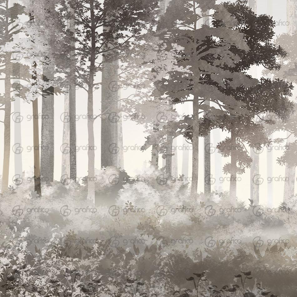 Атмосферная фреска  — таинственный лес в тумане, в мягкой серо-бежевой гамме с декоративными элементами в орнаментальном стиле. Фреска передаёт ощущение утренней тишины и свежести. Силуэты деревьев выстраиваются в мягкой дымке, создавая глубину и гармонию, а пространство наполняется спокойствием и природной силой. Дизайн выполнен в серо-бежевой палитре с плавными переходами оттенков и изящными декоративными узорами, едва заметно проступающими сквозь лесной фон. Такая комбинация подчёркивает утончённость стиля и добавляет композиции художественный характер. Фреска станет выразительным акцентом в интерьере, создавая атмосферу уюта и лёгкой мистики. Она идеально подойдёт для гостиной, спальни или кабинета, наполняя пространство глубиной и спокойствием. Применение: гостиная, спальня, кабинет, зона отдыха, интерьерное кафе.