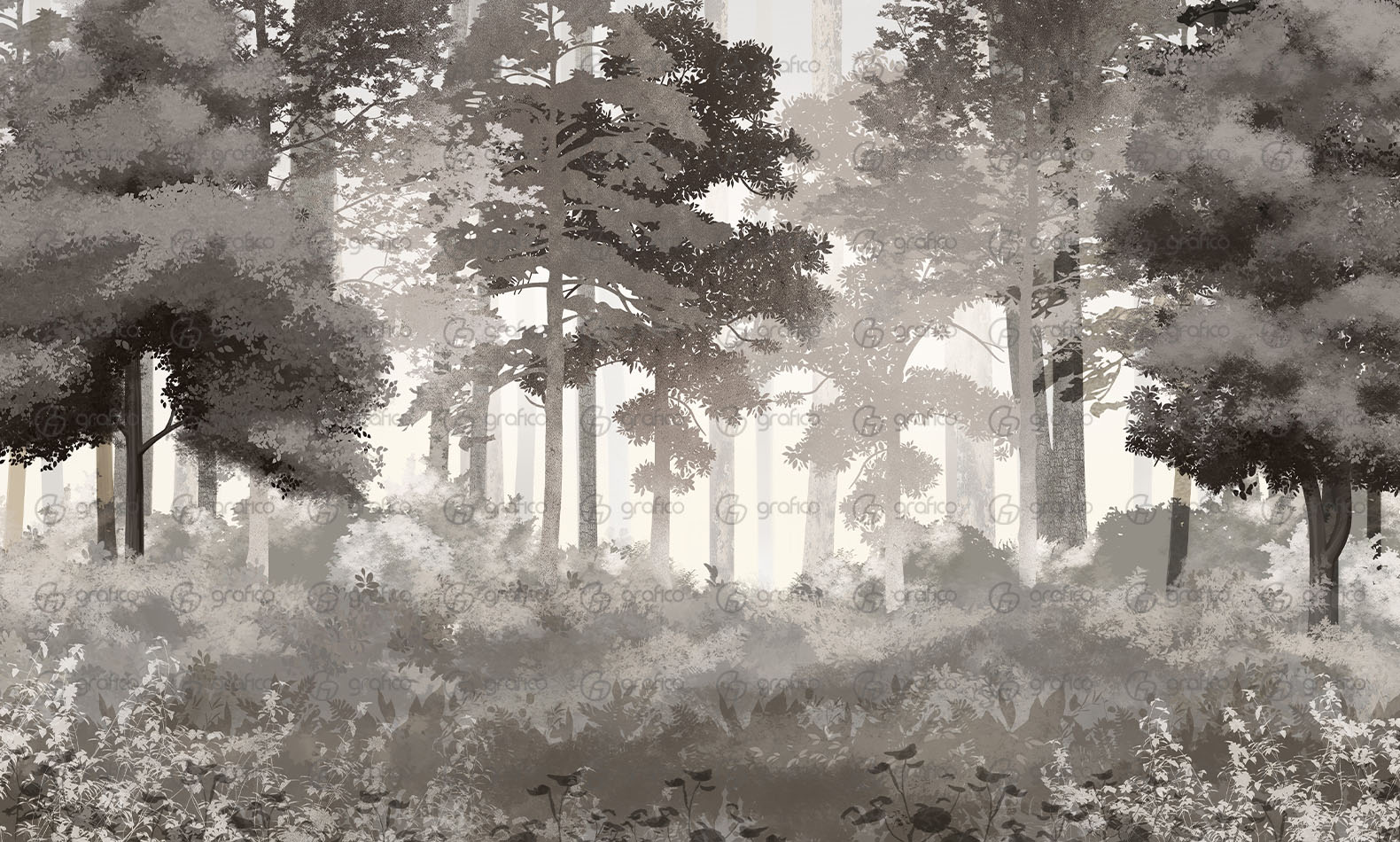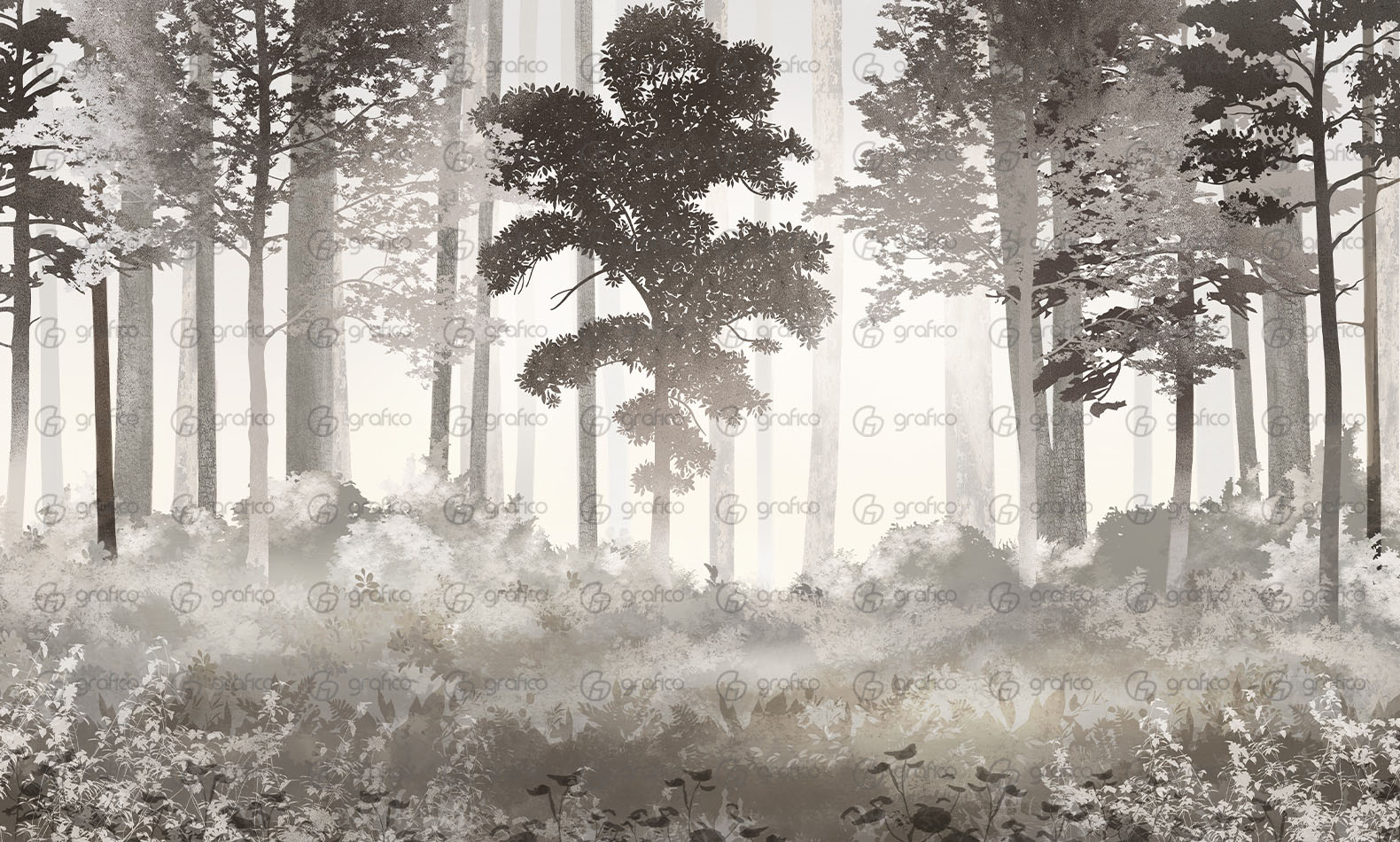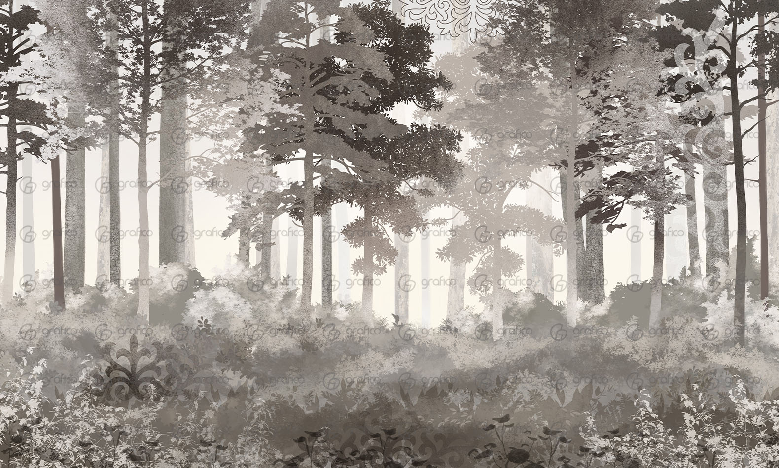 Атмосферная фреска  — таинственный лес в тумане, в мягкой серо-бежевой гамме с декоративными элементами в орнаментальном стиле. Фреска передаёт ощущение утренней тишины и свежести. Силуэты деревьев выстраиваются в мягкой дымке, создавая глубину и гармонию, а пространство наполняется спокойствием и природной силой. Дизайн выполнен в серо-бежевой палитре с плавными переходами оттенков и изящными декоративными узорами, едва заметно проступающими сквозь лесной фон. Такая комбинация подчёркивает утончённость стиля и добавляет композиции художественный характер. Фреска станет выразительным акцентом в интерьере, создавая атмосферу уюта и лёгкой мистики. Она идеально подойдёт для гостиной, спальни или кабинета, наполняя пространство глубиной и спокойствием. Применение: гостиная, спальня, кабинет, зона отдыха, интерьерное кафе.