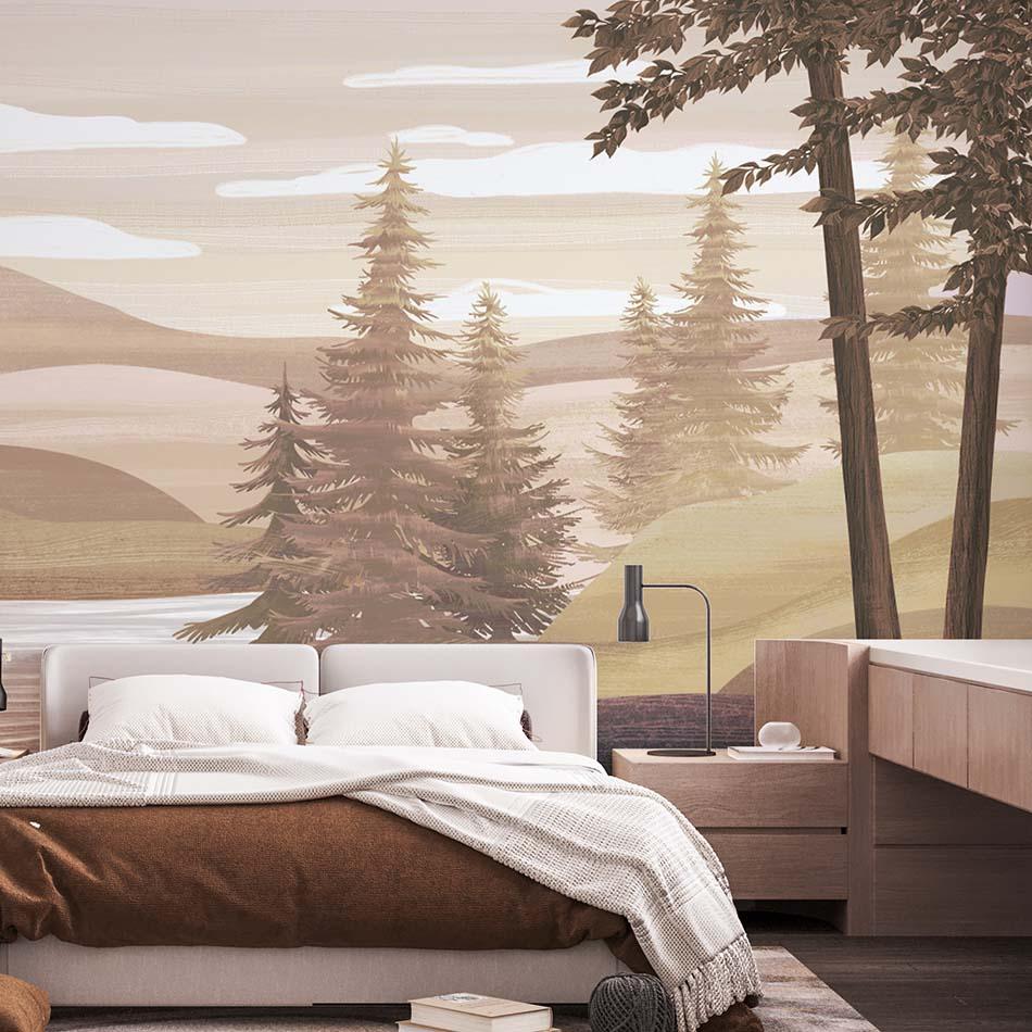 Бесшовная обои-фреска "Scenery" представляет собой умиротворяющий пастельный пейзаж, который принесёт в интерьер атмосферу спокойствия и гармонии. Изображение сочетает мягкие, размытые силуэты гор, отражающиеся в водной глади, с детально прорисованными хвойными деревьями и массивными валунами на переднем плане. Нежная, приглушённая цветовая палитра из бежевых, оливковых и серо-голубых оттенков создаёт ощущение свежести и естественности. Этот дизайн идеально подходит для спальни, гостиной или кабинета, помогая создать уютное и расслабляющее пространство.