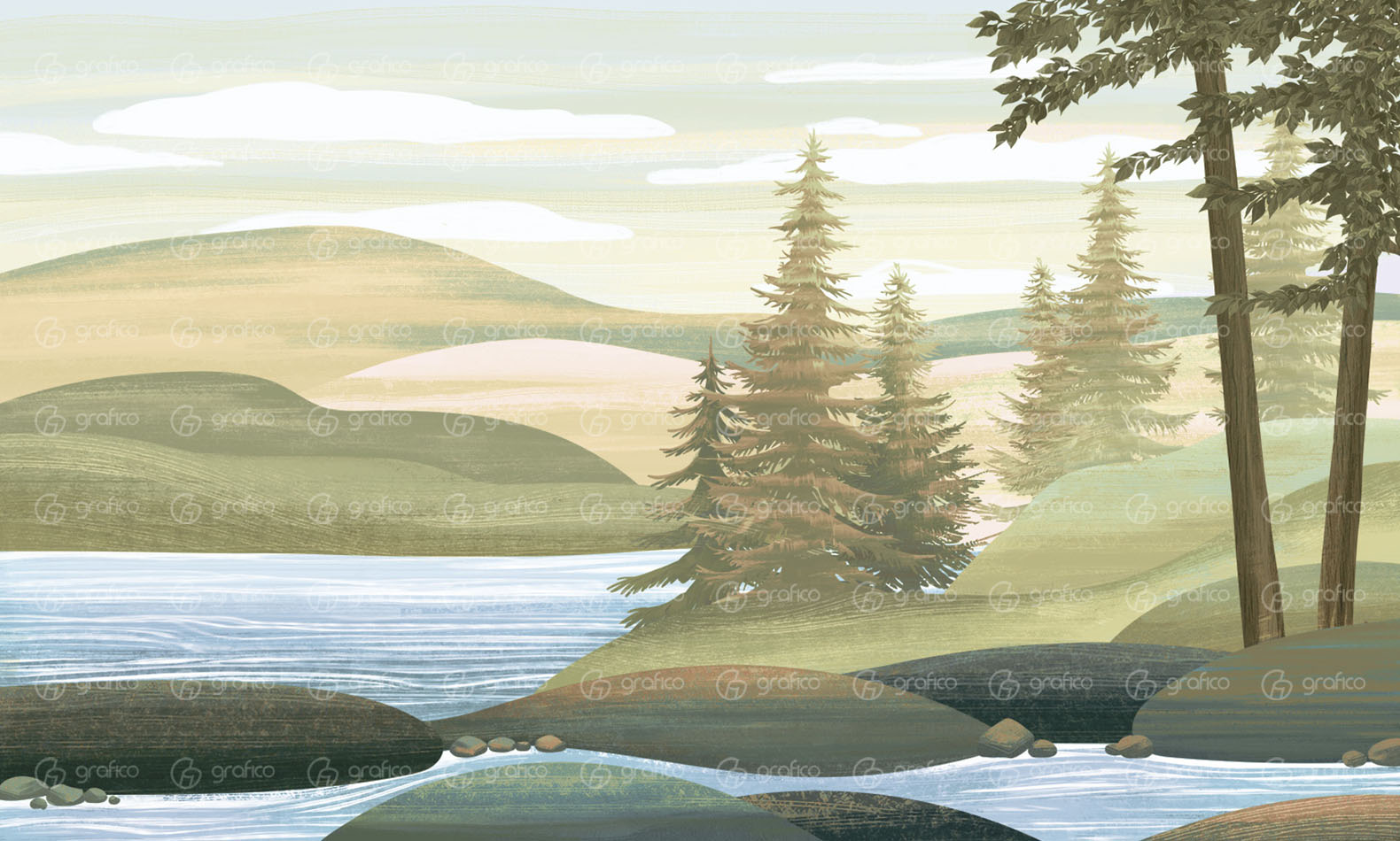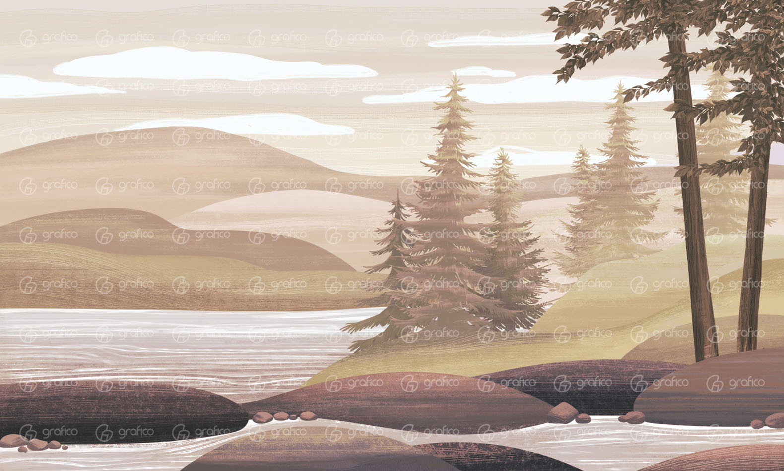 Бесшовная обои-фреска "Scenery" представляет собой умиротворяющий пастельный пейзаж, который принесёт в интерьер атмосферу спокойствия и гармонии. Изображение сочетает мягкие, размытые силуэты гор, отражающиеся в водной глади, с детально прорисованными хвойными деревьями и массивными валунами на переднем плане. Нежная, приглушённая цветовая палитра из бежевых, оливковых и серо-голубых оттенков создаёт ощущение свежести и естественности. Этот дизайн идеально подходит для спальни, гостиной или кабинета, помогая создать уютное и расслабляющее пространство.