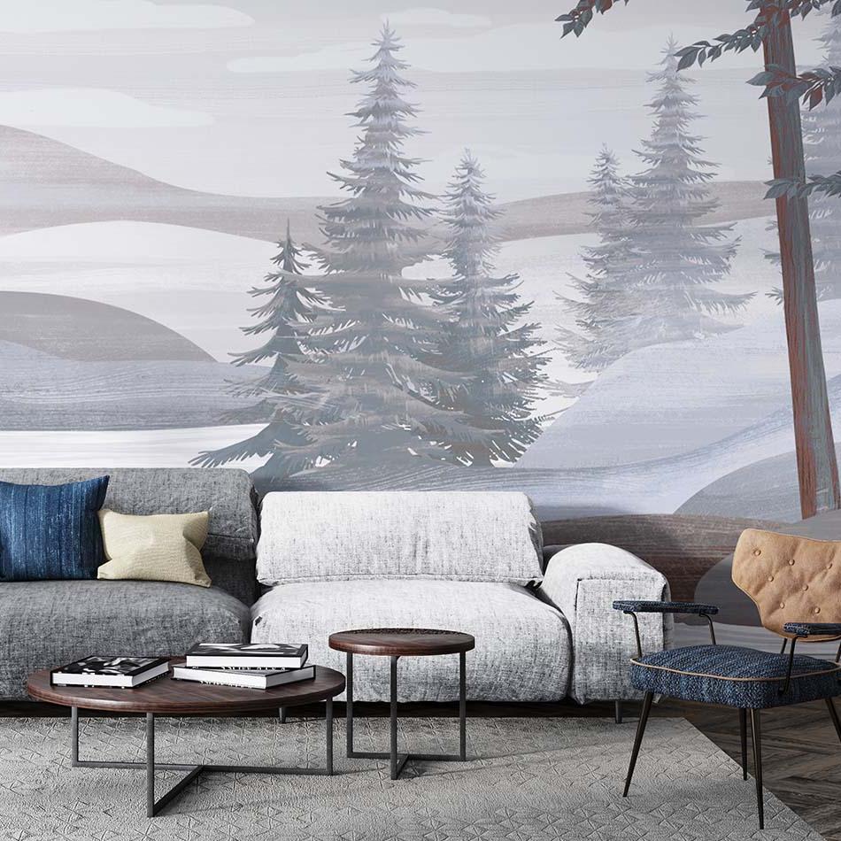 Бесшовная обои-фреска "Scenery" представляет собой умиротворяющий пастельный пейзаж, который принесёт в интерьер атмосферу спокойствия и гармонии. Изображение сочетает мягкие, размытые силуэты гор, отражающиеся в водной глади, с детально прорисованными хвойными деревьями и массивными валунами на переднем плане. Нежная, приглушённая цветовая палитра из бежевых, оливковых и серо-голубых оттенков создаёт ощущение свежести и естественности. Этот дизайн идеально подходит для спальни, гостиной или кабинета, помогая создать уютное и расслабляющее пространство.